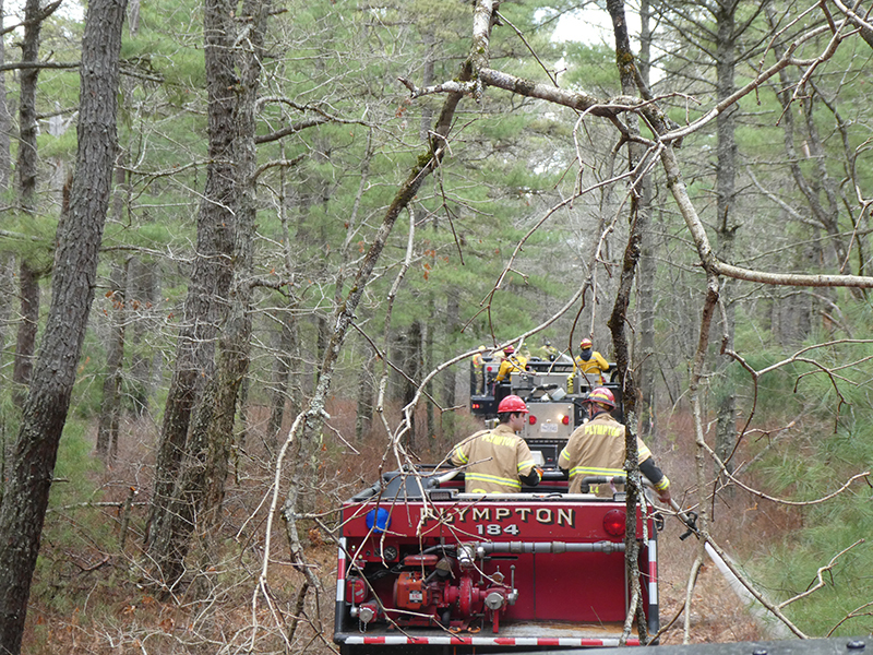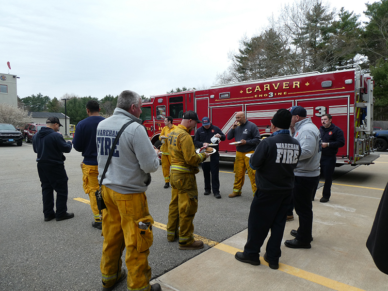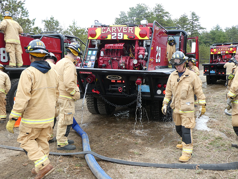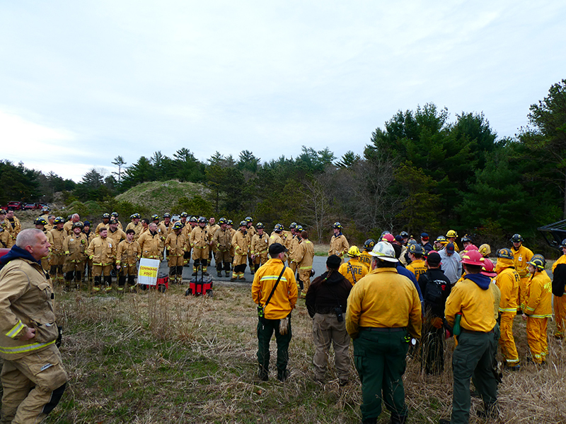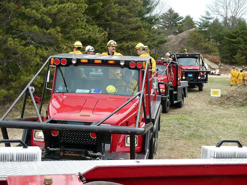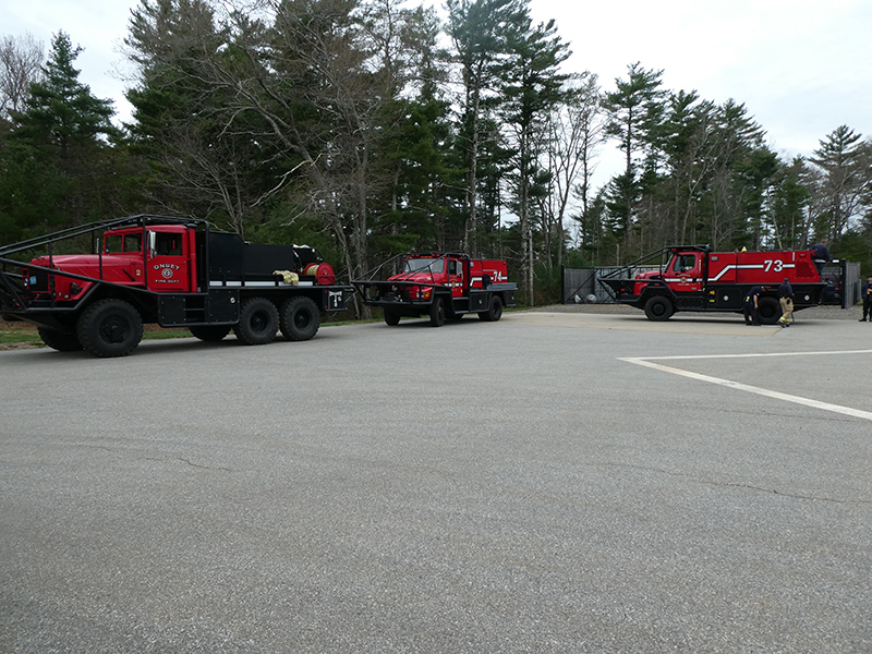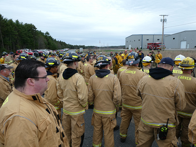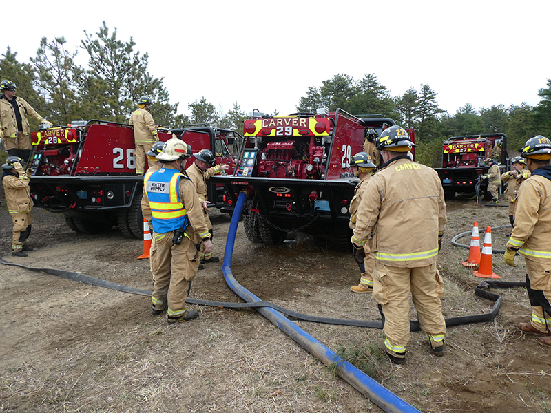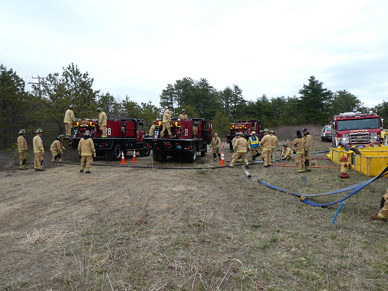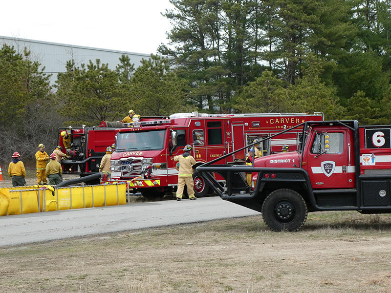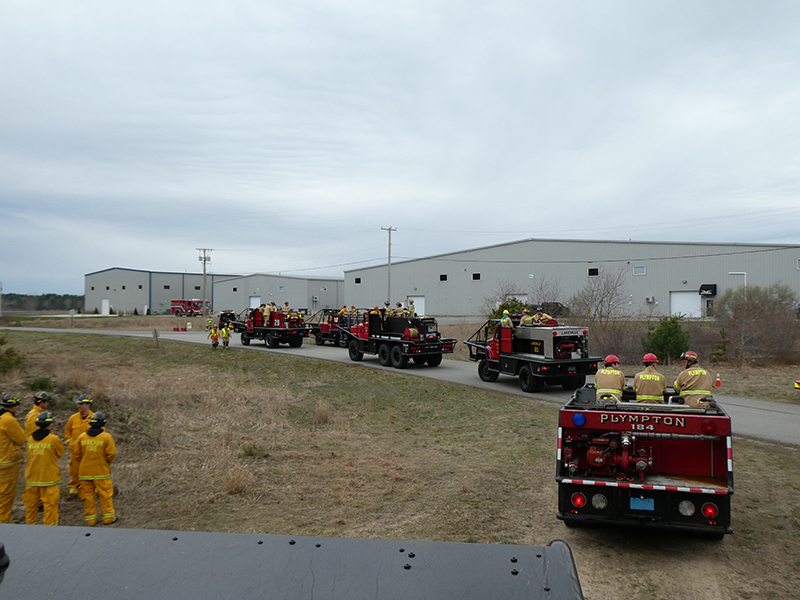 This year’s Annual Deputy Drill focused on a large-scale Wildfire training at the Plymouth/Carver Airport area. For many years, the airport has been kind enough to allow us to use a large rear wooded parcel to practice our breaker driving skills under realistic conditions. An estimated 150 Officers and Firefighters from 9 Towns and State agencies, utilizing 14 Brush Breakers, 1 Forestry Truck, 2 Tankers, 2 Engines, numerous Command Vehicles, and Chief Officers, participated in the morning exercise. The drill focused on brush breaker driver operator training techniques, wildfire crew operations, water resupply training, a chainsaw safety class, and a brush breaker winch operations course. Brush Breakers, guided by our Fire Officers and Station Trainers, traveled a heavily wooded course set up by Deputy Germaine to simulated flanks of the fire, driving through a wood road course utilizing all the water each carried. A water supply training component with crews consistently refilling each Brush Breaker using Tankers 1, Tanker 2, and Engine 2. Tankers 1 and 2 shuttled over 15,000 gallons of water for breakers to quickly fill up and get back to work. A big thank you to all our Officers and Firelighters for attending and helping throughout the day! Overall, our goal of giving each Firefighter a real-life training experience and increasing their knowledge of working with our large bush breakers was accomplished! Hats off to Deputy Germaine for organizing the drill, CFD Assistant Deputy Boyle, our Officer core, and Chiefs and Officers from surrounding communities for giving up their Sunday to help! Big props to our Station coverage crew and our awesome chefs back at Station 1, who served almost 200 hamburgers and hot dogs to the hungry troops at the conclusion of the drill. (Photo’s by Firefighter, Steve Falconer)