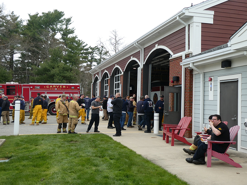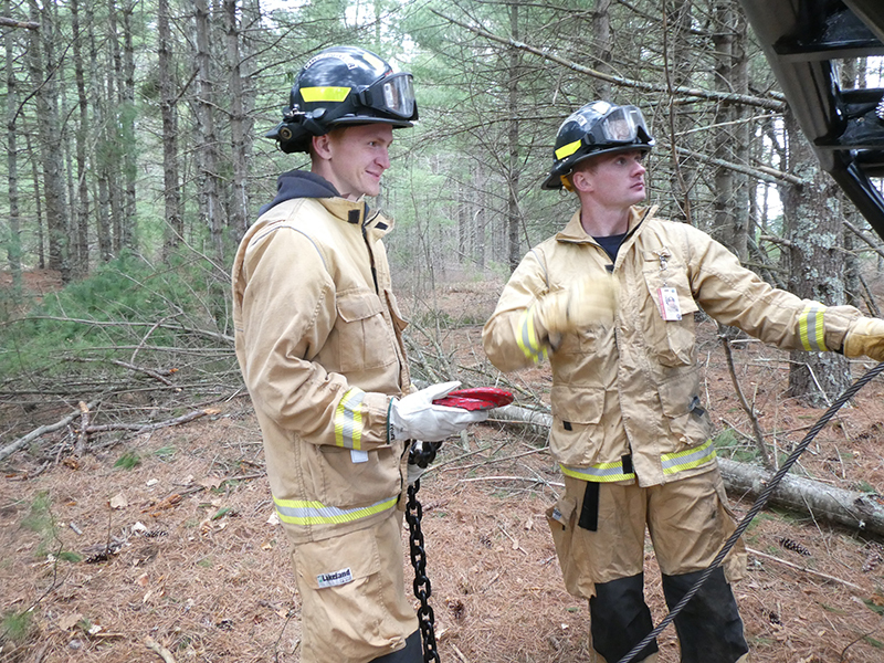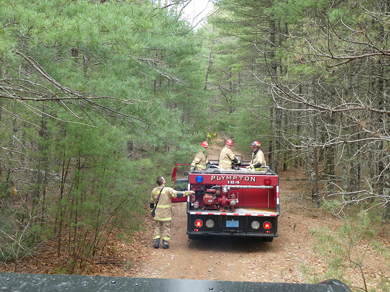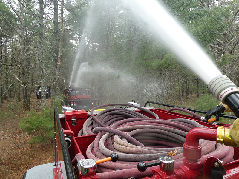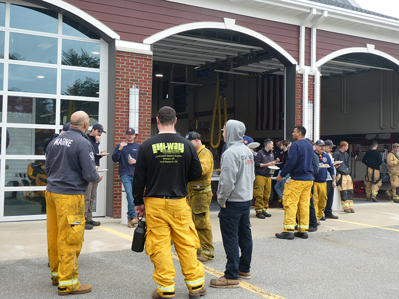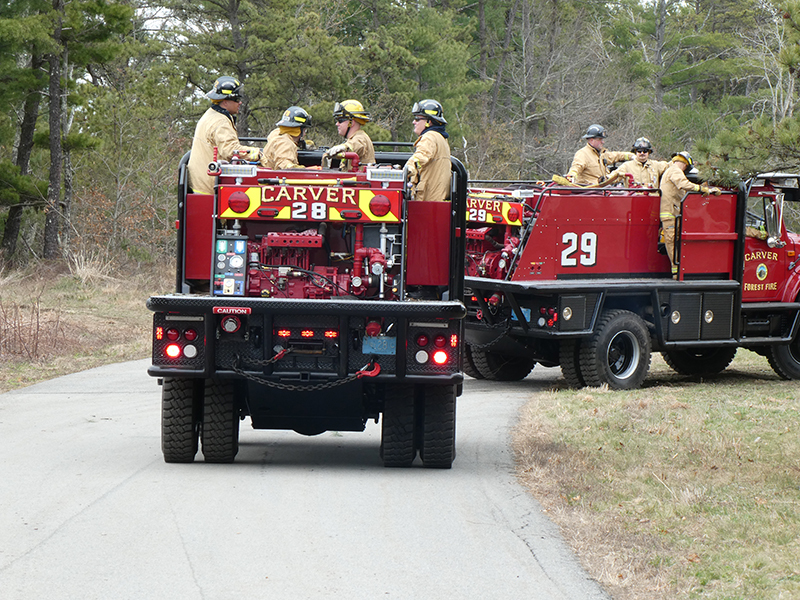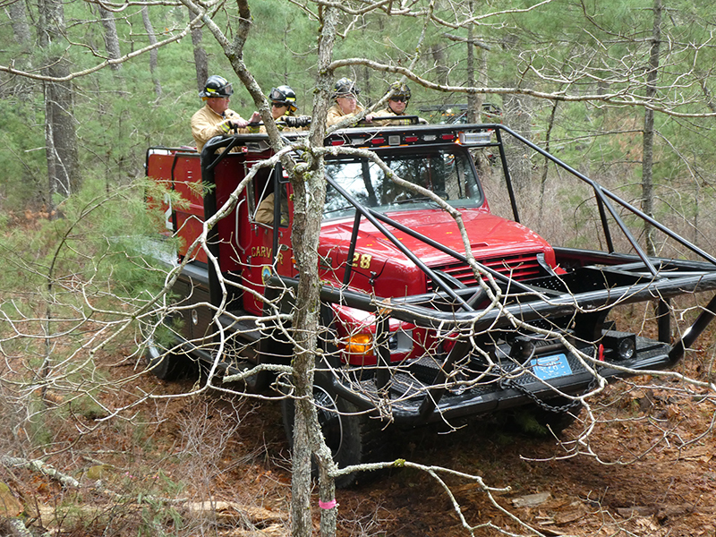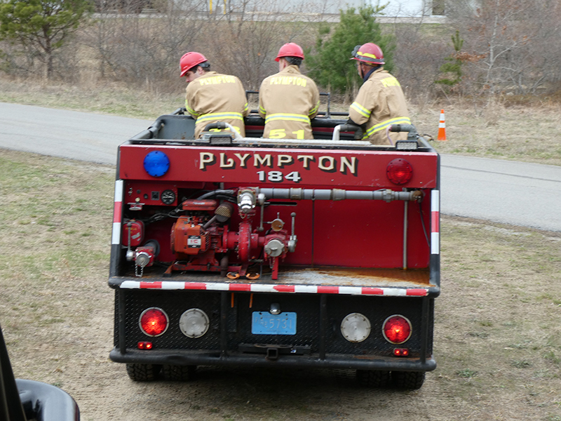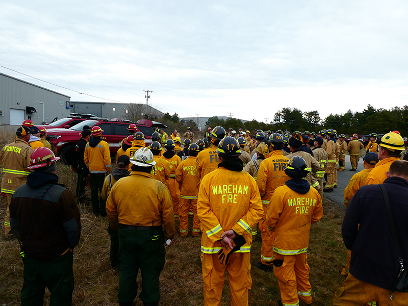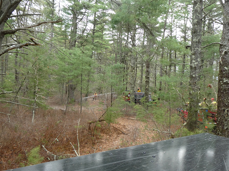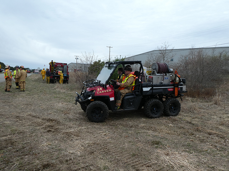 This year’s Annual Deputy Drill focused on a large-scale Wildfire training at the Plymouth/Carver Airport area. For many years, the airport has been kind enough to allow us to use a large rear wooded parcel to practice our breaker driving skills under realistic conditions. An estimated 150 Officers and Firefighters from 9 Towns and State agencies, utilizing 14 Brush Breakers, 1 Forestry Truck, 2 Tankers, 2 Engines, numerous Command Vehicles, and Chief Officers, participated in the morning exercise. The drill focused on brush breaker driver operator training techniques, wildfire crew operations, water resupply training, a chainsaw safety class, and a brush breaker winch operations course. Brush Breakers, guided by our Fire Officers and Station Trainers, traveled a heavily wooded course set up by Deputy Germaine to simulated flanks of the fire, driving through a wood road course utilizing all the water each carried. A water supply training component with crews consistently refilling each Brush Breaker using Tankers 1, Tanker 2, and Engine 2. Tankers 1 and 2 shuttled over 15,000 gallons of water for breakers to quickly fill up and get back to work. A big thank you to all our Officers and Firelighters for attending and helping throughout the day! Overall, our goal of giving each Firefighter a real-life training experience and increasing their knowledge of working with our large bush breakers was accomplished! Hats off to Deputy Germaine for organizing the drill, CFD Assistant Deputy Boyle, our Officer core, and Chiefs and Officers from surrounding communities for giving up their Sunday to help! Big props to our Station coverage crew and our awesome chefs back at Station 1, who served almost 200 hamburgers and hot dogs to the hungry troops at the conclusion of the drill. (Photo’s by Firefighter, Steve Falconer)