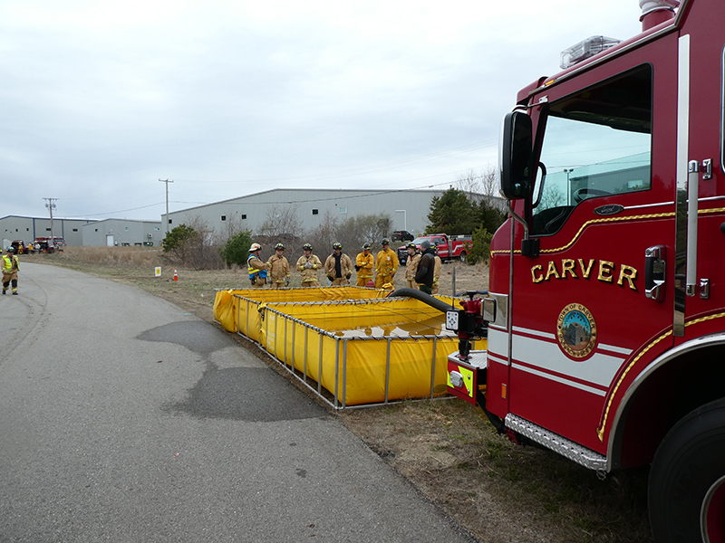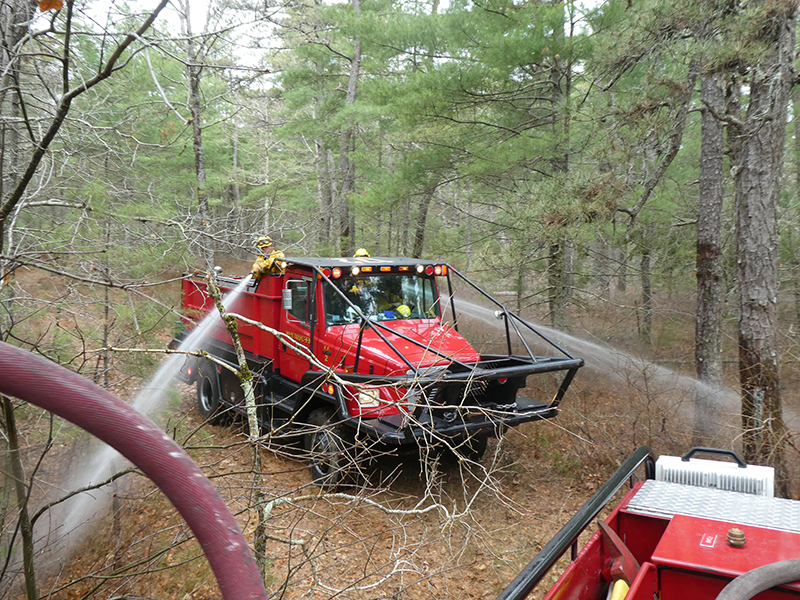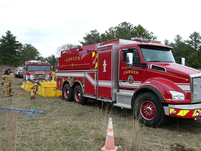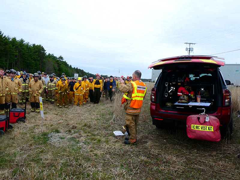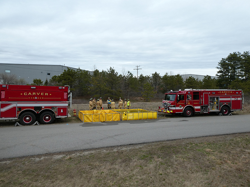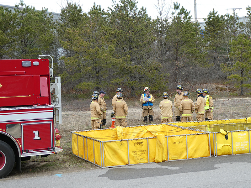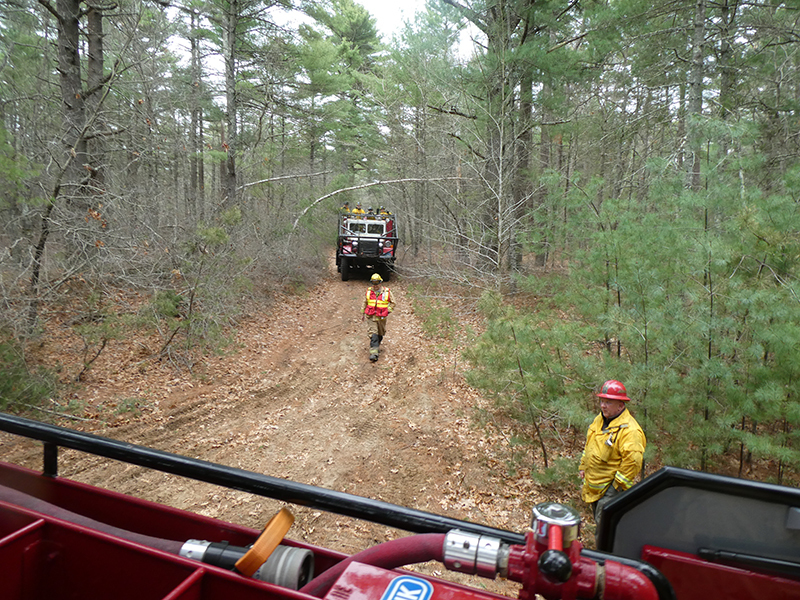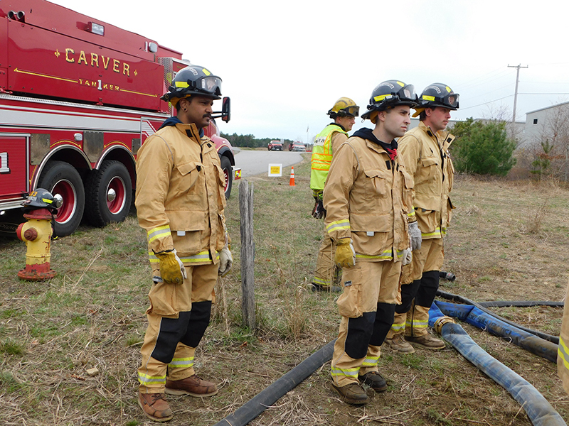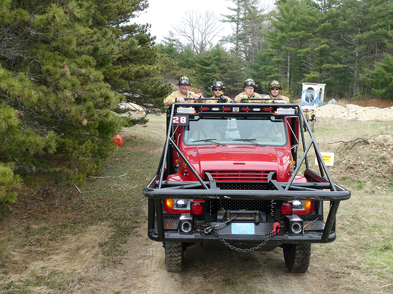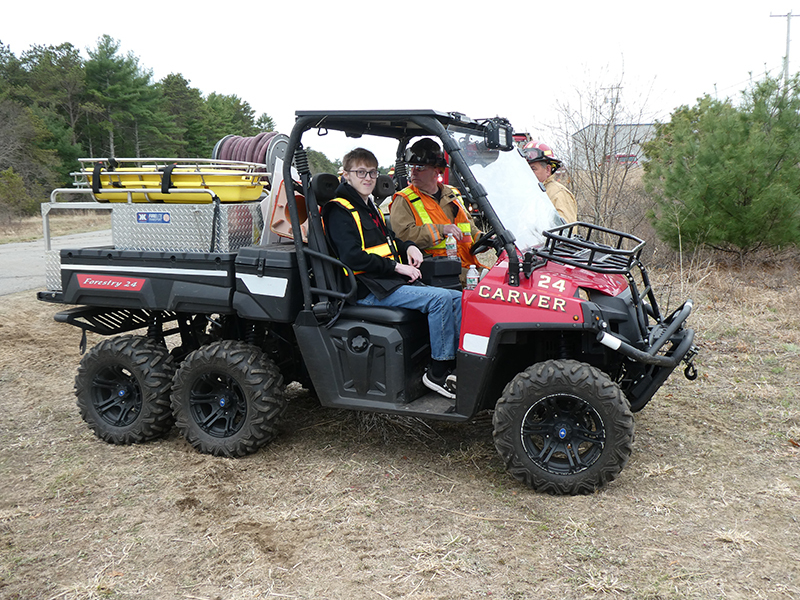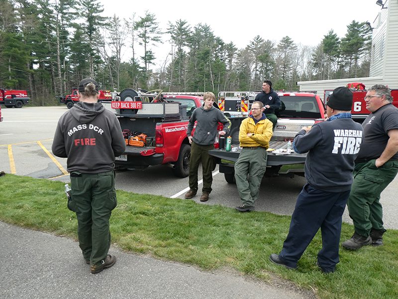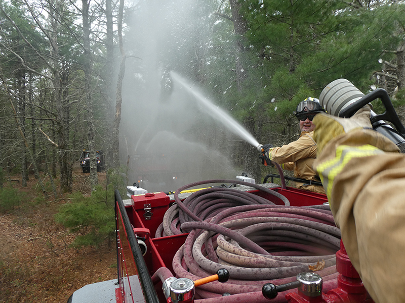 This year’s Annual Deputy Drill focused on a large-scale Wildfire training at the Plymouth/Carver Airport area. For many years, the airport has been kind enough to allow us to use a large rear wooded parcel to practice our breaker driving skills under realistic conditions. An estimated 150 Officers and Firefighters from 9 Towns and State agencies, utilizing 14 Brush Breakers, 1 Forestry Truck, 2 Tankers, 2 Engines, numerous Command Vehicles, and Chief Officers, participated in the morning exercise. The drill focused on brush breaker driver operator training techniques, wildfire crew operations, water resupply training, a chainsaw safety class, and a brush breaker winch operations course. Brush Breakers, guided by our Fire Officers and Station Trainers, traveled a heavily wooded course set up by Deputy Germaine to simulated flanks of the fire, driving through a wood road course utilizing all the water each carried. A water supply training component with crews consistently refilling each Brush Breaker using Tankers 1, Tanker 2, and Engine 2. Tankers 1 and 2 shuttled over 15,000 gallons of water for breakers to quickly fill up and get back to work. A big thank you to all our Officers and Firelighters for attending and helping throughout the day! Overall, our goal of giving each Firefighter a real-life training experience and increasing their knowledge of working with our large bush breakers was accomplished! Hats off to Deputy Germaine for organizing the drill, CFD Assistant Deputy Boyle, our Officer core, and Chiefs and Officers from surrounding communities for giving up their Sunday to help! Big props to our Station coverage crew and our awesome chefs back at Station 1, who served almost 200 hamburgers and hot dogs to the hungry troops at the conclusion of the drill. (Photo’s by Firefighter, Steve Falconer)