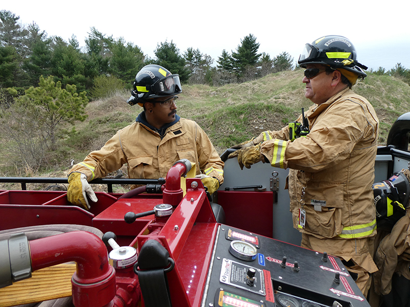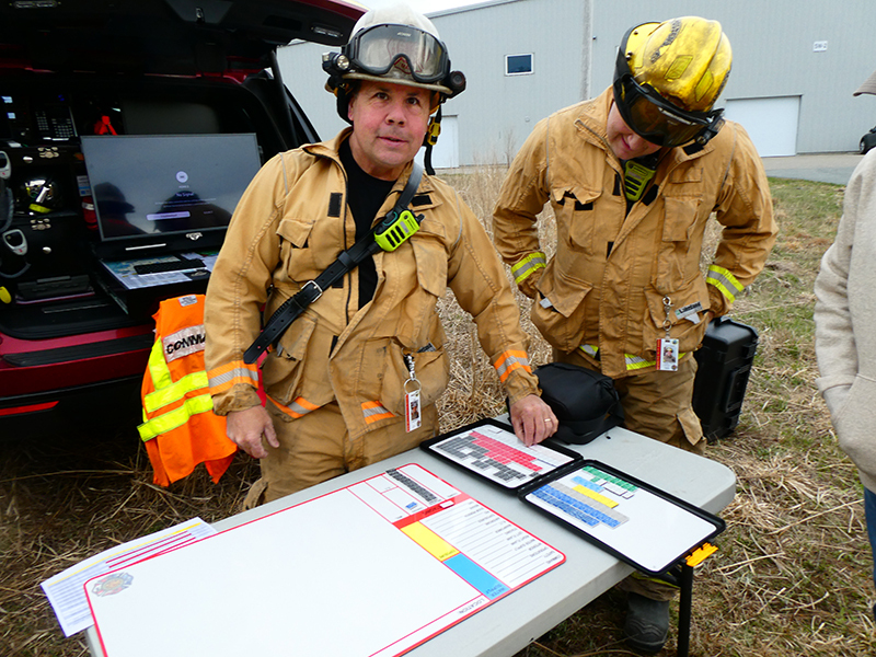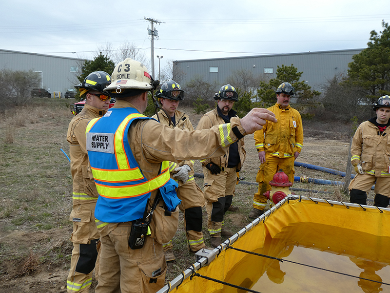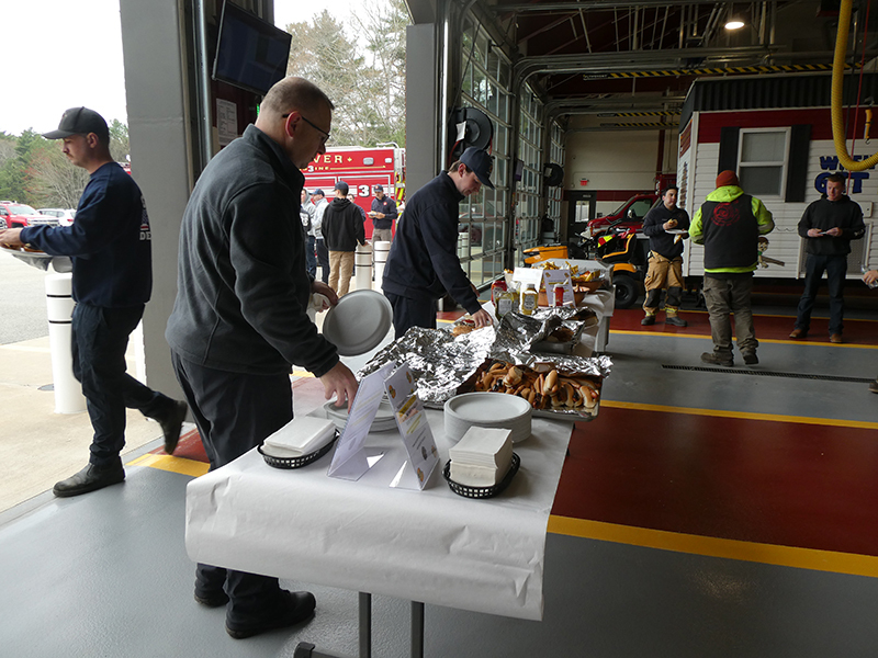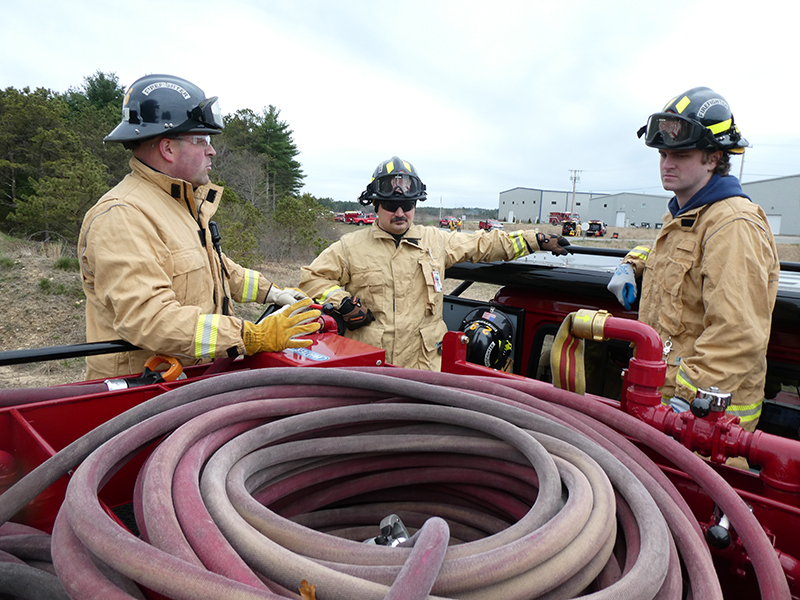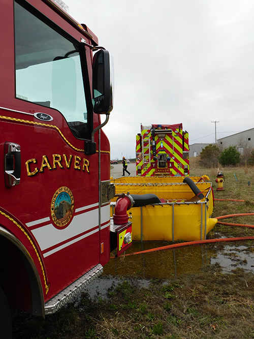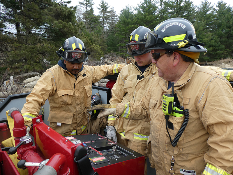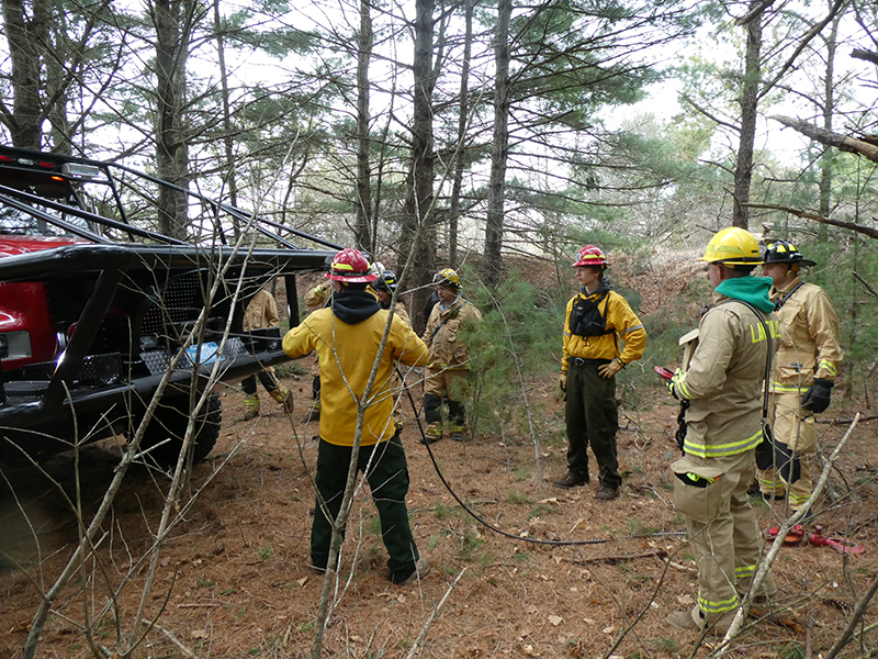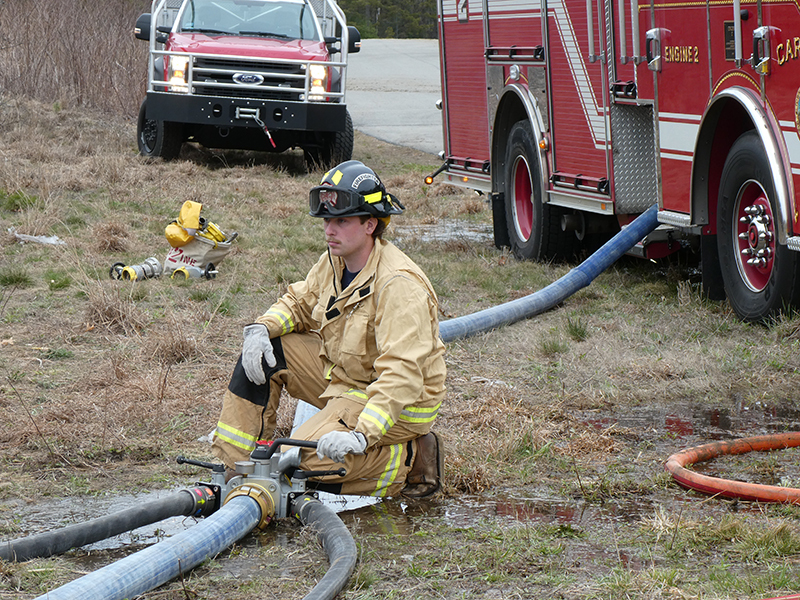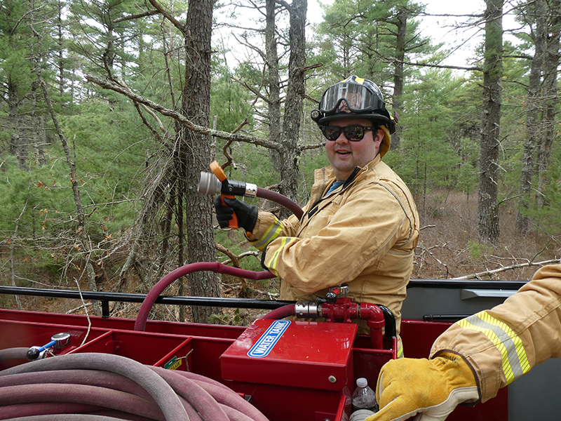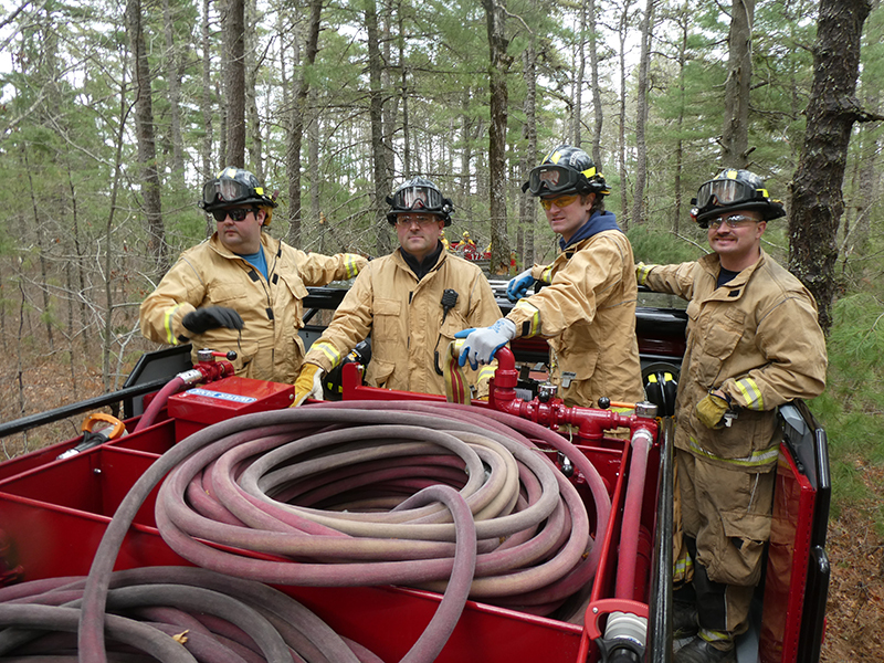 This year’s Annual Deputy Drill focused on a large-scale Wildfire training at the Plymouth/Carver Airport area. For many years, the airport has been kind enough to allow us to use a large rear wooded parcel to practice our breaker driving skills under realistic conditions. An estimated 150 Officers and Firefighters from 9 Towns and State agencies, utilizing 14 Brush Breakers, 1 Forestry Truck, 2 Tankers, 2 Engines, numerous Command Vehicles, and Chief Officers, participated in the morning exercise. The drill focused on brush breaker driver operator training techniques, wildfire crew operations, water resupply training, a chainsaw safety class, and a brush breaker winch operations course. Brush Breakers, guided by our Fire Officers and Station Trainers, traveled a heavily wooded course set up by Deputy Germaine to simulated flanks of the fire, driving through a wood road course utilizing all the water each carried. A water supply training component with crews consistently refilling each Brush Breaker using Tankers 1, Tanker 2, and Engine 2. Tankers 1 and 2 shuttled over 15,000 gallons of water for breakers to quickly fill up and get back to work. A big thank you to all our Officers and Firelighters for attending and helping throughout the day! Overall, our goal of giving each Firefighter a real-life training experience and increasing their knowledge of working with our large bush breakers was accomplished! Hats off to Deputy Germaine for organizing the drill, CFD Assistant Deputy Boyle, our Officer core, and Chiefs and Officers from surrounding communities for giving up their Sunday to help! Big props to our Station coverage crew and our awesome chefs back at Station 1, who served almost 200 hamburgers and hot dogs to the hungry troops at the conclusion of the drill. (Photo’s by Firefighter, Steve Falconer)