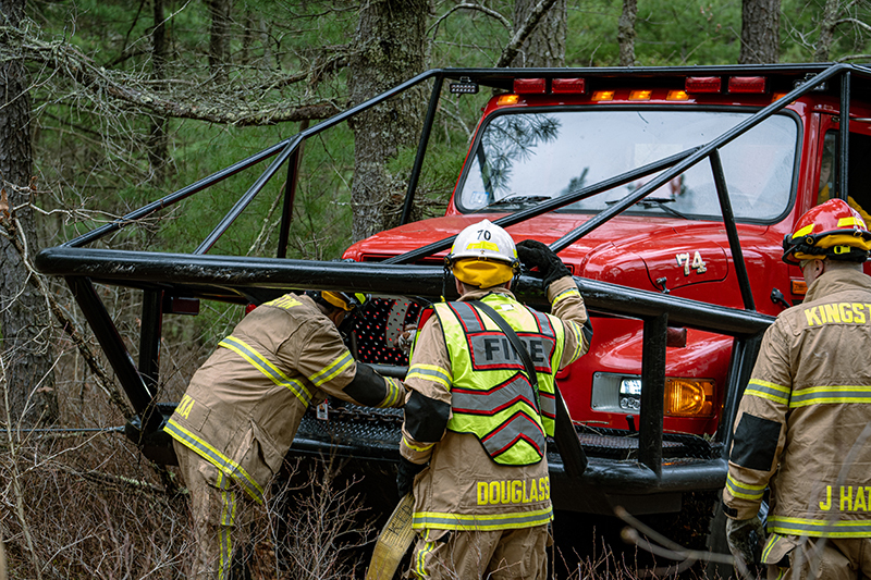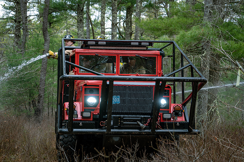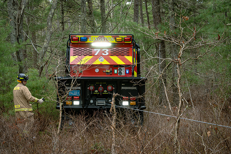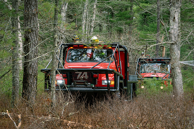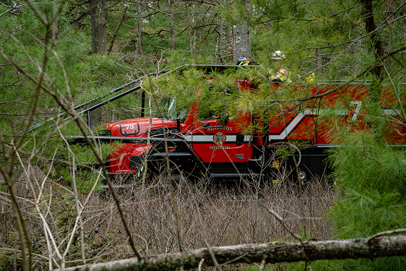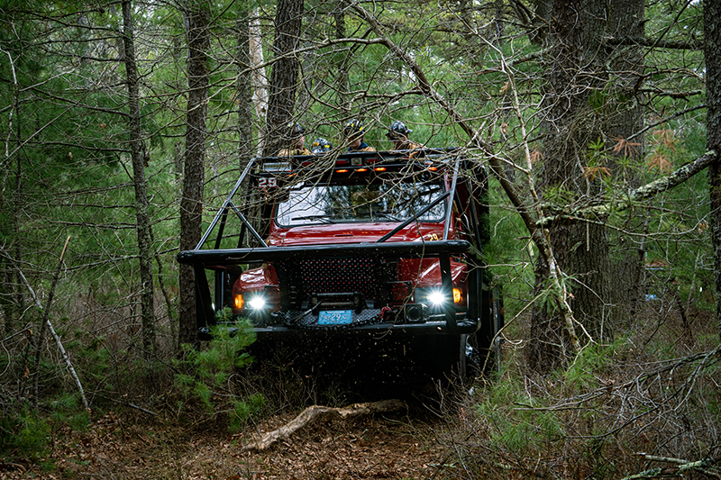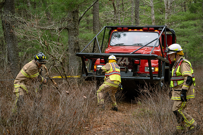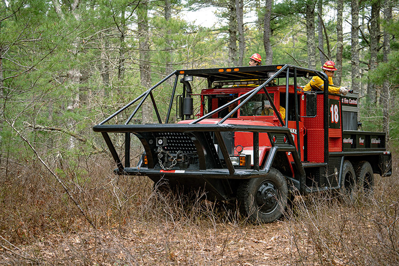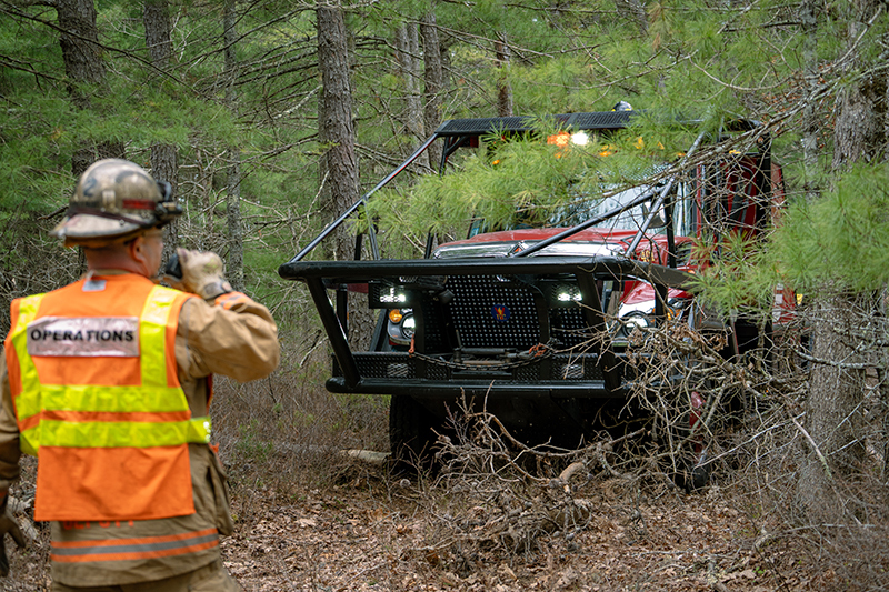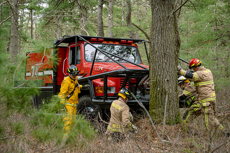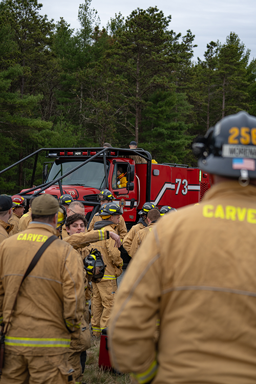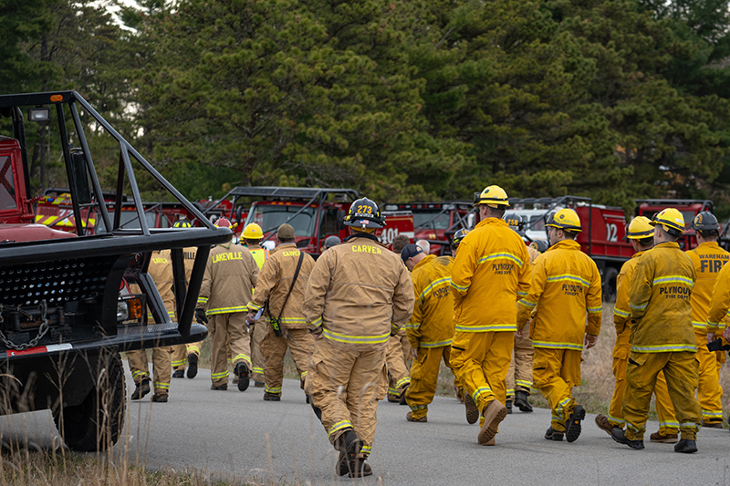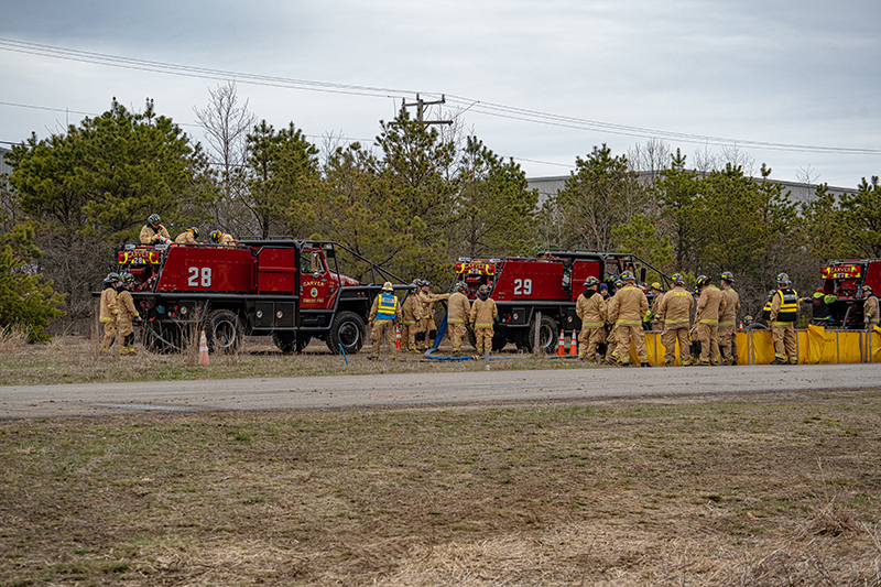 This year’s Annual Deputy Drill focused on a large-scale Wildfire training at the Plymouth/Carver Airport area. For many years, the airport has been kind enough to allow us to use a large rear wooded parcel to practice our breaker driving skills under realistic conditions. An estimated 150 Officers and Firefighters from 9 Towns and State agencies, utilizing 14 Brush Breakers, 1 Forestry Truck, 2 Tankers, 2 Engines, numerous Command Vehicles, and Chief Officers, participated in the morning exercise. The drill focused on brush breaker driver operator training techniques, wildfire crew operations, water resupply training, a chainsaw safety class, and a brush breaker winch operations course. Brush Breakers, guided by our Fire Officers and Station Trainers, traveled a heavily wooded course set up by Deputy Germaine to simulated flanks of the fire, driving through a wood road course utilizing all the water each carried. A water supply training component with crews consistently refilling each Brush Breaker using Tankers 1, Tanker 2, and Engine 2. Tankers 1 and 2 shuttled over 15,000 gallons of water for breakers to quickly fill up and get back to work. A big thank you to all our Officers and Firelighters for attending and helping throughout the day! Overall, our goal of giving each Firefighter a real-life training experience and increasing their knowledge of working with our large bush breakers was accomplished! Hats off to Deputy Germaine for organizing the drill, CFD Assistant Deputy Boyle, our Officer core, and Chiefs and Officers from surrounding communities for giving up their Sunday to help! Big props to our Station coverage crew and our awesome chefs back at Station 1, who served almost 200 hamburgers and hot dogs to the hungry troops at the conclusion of the drill. (Photo’s by Future CFD Firefighter, Matt Heath)