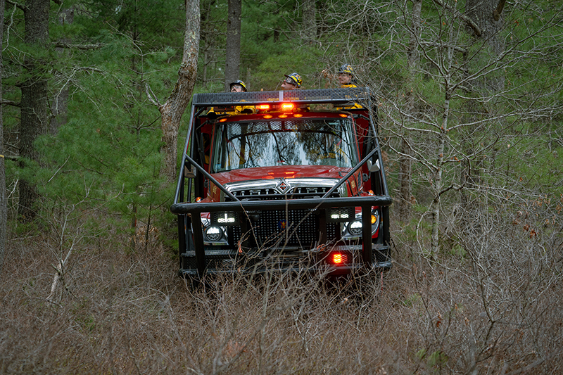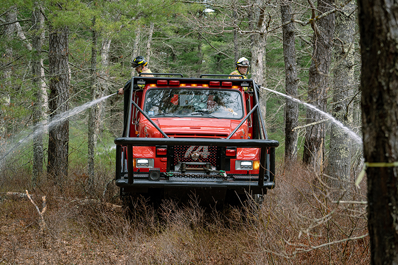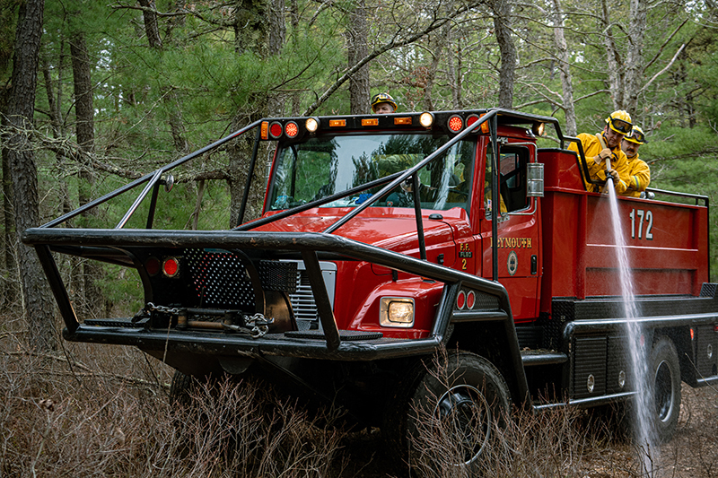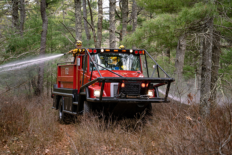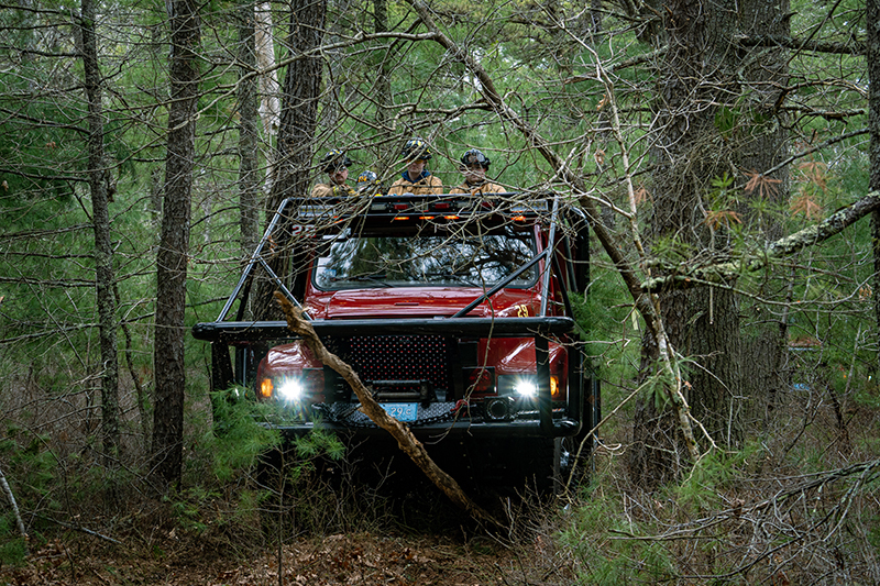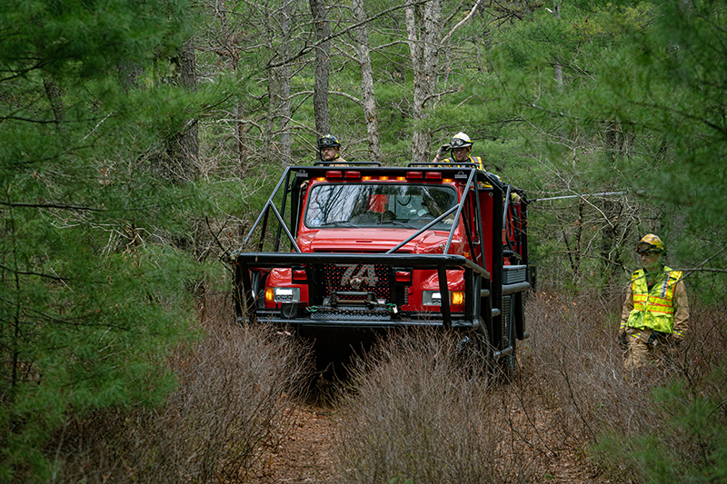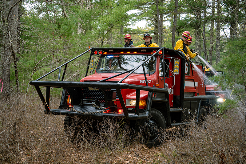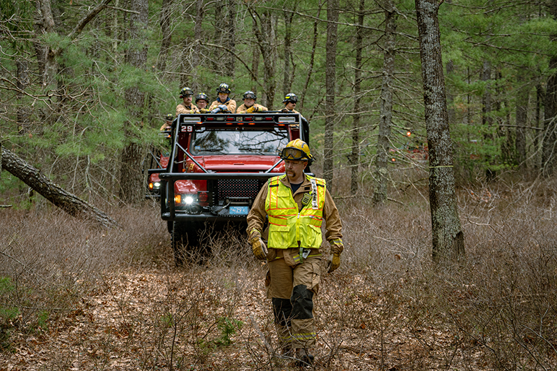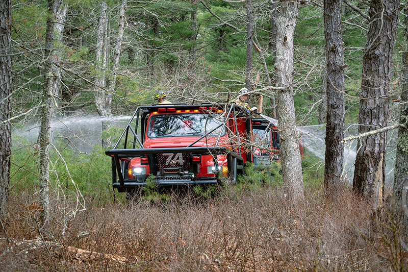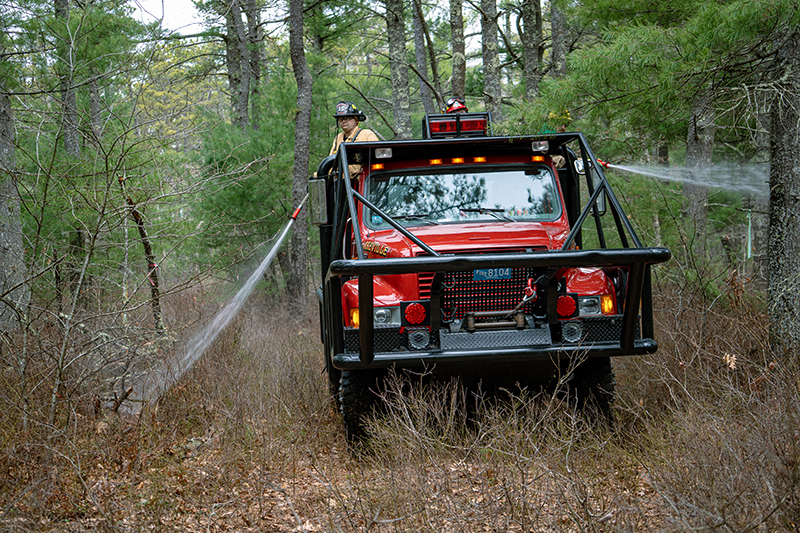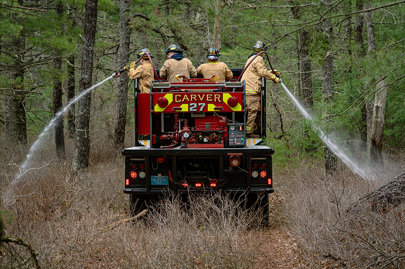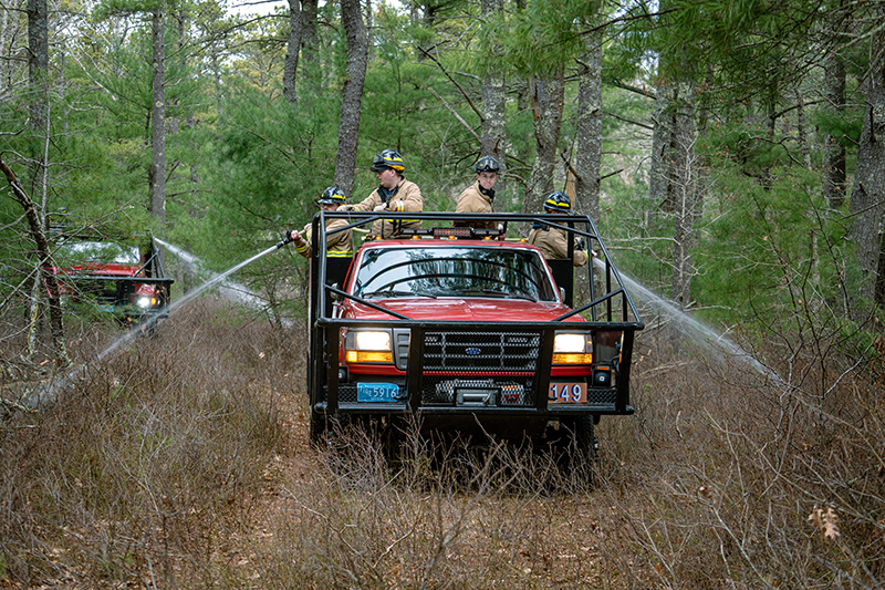 This year’s Annual Deputy Drill focused on a large-scale Wildfire training at the Plymouth/Carver Airport area. For many years, the airport has been kind enough to allow us to use a large rear wooded parcel to practice our breaker driving skills under realistic conditions. An estimated 150 Officers and Firefighters from 9 Towns and State agencies, utilizing 14 Brush Breakers, 1 Forestry Truck, 2 Tankers, 2 Engines, numerous Command Vehicles, and Chief Officers, participated in the morning exercise. The drill focused on brush breaker driver operator training techniques, wildfire crew operations, water resupply training, a chainsaw safety class, and a brush breaker winch operations course. Brush Breakers, guided by our Fire Officers and Station Trainers, traveled a heavily wooded course set up by Deputy Germaine to simulated flanks of the fire, driving through a wood road course utilizing all the water each carried. A water supply training component with crews consistently refilling each Brush Breaker using Tankers 1, Tanker 2, and Engine 2. Tankers 1 and 2 shuttled over 15,000 gallons of water for breakers to quickly fill up and get back to work. A big thank you to all our Officers and Firelighters for attending and helping throughout the day! Overall, our goal of giving each Firefighter a real-life training experience and increasing their knowledge of working with our large bush breakers was accomplished! Hats off to Deputy Germaine for organizing the drill, CFD Assistant Deputy Boyle, our Officer core, and Chiefs and Officers from surrounding communities for giving up their Sunday to help! Big props to our Station coverage crew and our awesome chefs back at Station 1, who served almost 200 hamburgers and hot dogs to the hungry troops at the conclusion of the drill. (Photo’s by Future CFD Firefighter, Matt Heath)