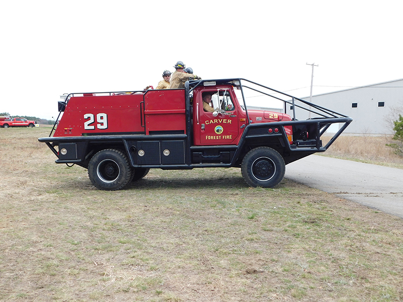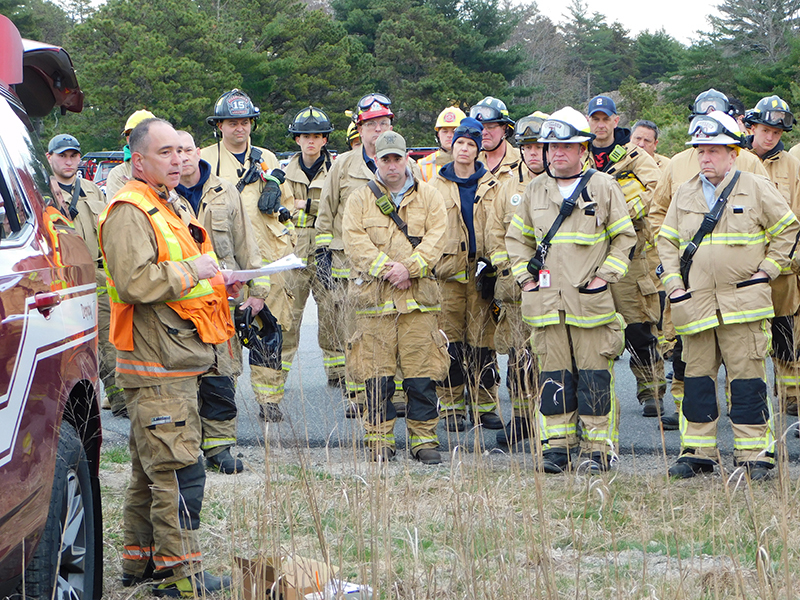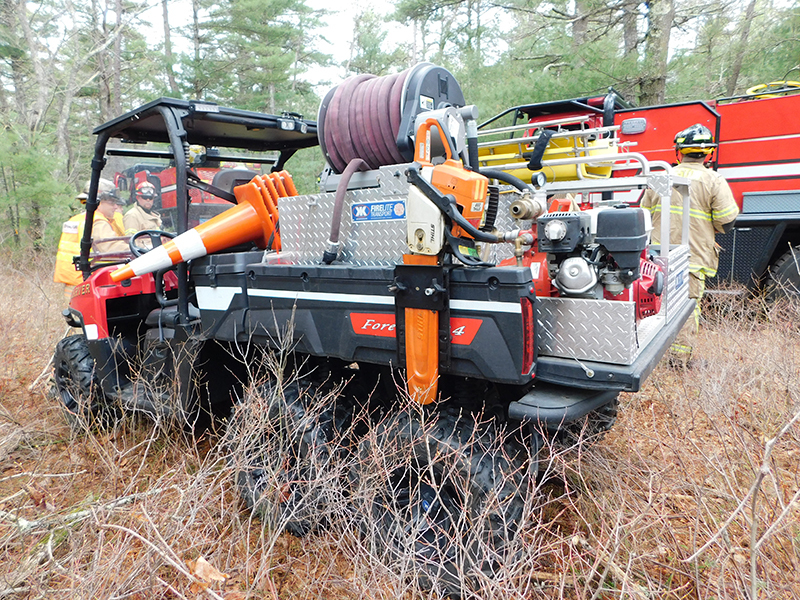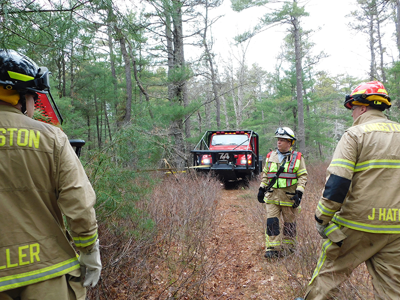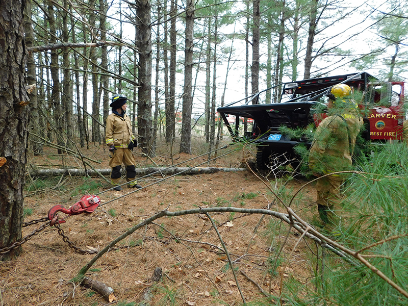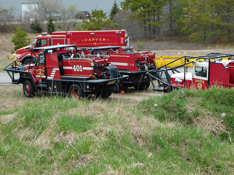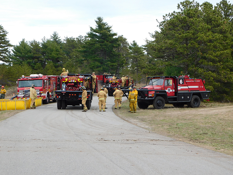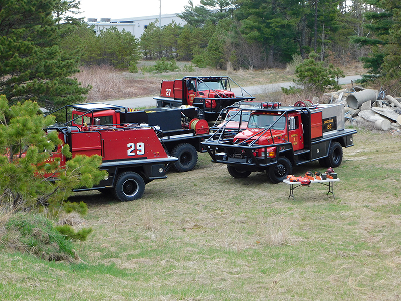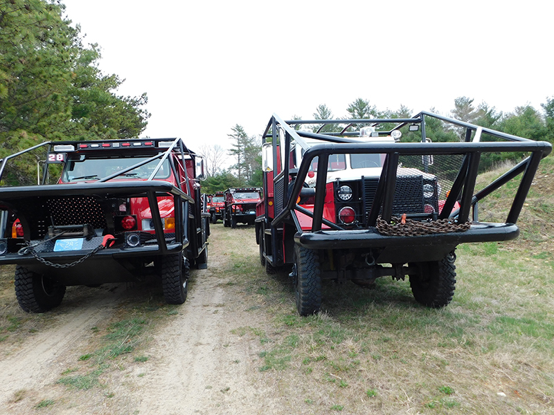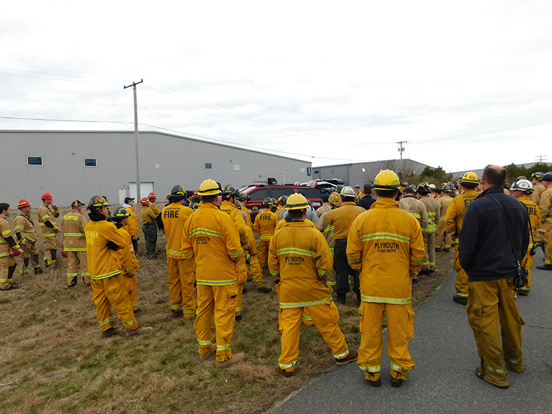 This year’s Annual Deputy Drill focused on a large-scale Wildfire training at the Plymouth/Carver Airport area.  For many years, the airport has been kind enough to allow us to use a large rear wooded parcel to practice our breaker driving skills under realistic conditions.  An estimated 150 Officers and Firefighters from 9 Towns and State agencies, utilizing 14 Brush Breakers, 1 Forestry Truck, 2 Tankers, 2 Engines, numerous Command Vehicles, and Chief Officers, participated in the morning exercise.  The drill focused on brush breaker driver operator training techniques, wildfire crew operations, water resupply training, a chainsaw safety class, and a brush breaker winch operations course.  Brush Breakers, guided by our Fire Officers and Station Trainers, traveled a heavily wooded course set up by Deputy Germaine to simulated flanks of the fire, driving through a wood road course utilizing all the water each carried.  A water supply training component with crews consistently refilling each Brush Breaker using Tankers 1, Tanker 2, and Engine 2.  Tankers 1 and 2 shuttled over 15,000 gallons of water for breakers to quickly fill up and get back to work.  A big thank you to all our Officers and Firelighters for attending and helping throughout the day! Overall, our goal of giving each Firefighter a real-life training experience and increasing their knowledge of working with our large bush breakers was accomplished!  Hats off to Deputy Germaine for organizing the drill, CFD Assistant Deputy Boyle, our Officer core, and Chiefs and Officers from surrounding communities for giving up their Sunday to help! Big props to our Station coverage crew and our awesome chefs back at Station 1, who served almost 200 hamburgers and hot dogs to the hungry troops at the conclusion of the drill. (Photo’s by Retired CFD Firefighter, Rick Leopardi)