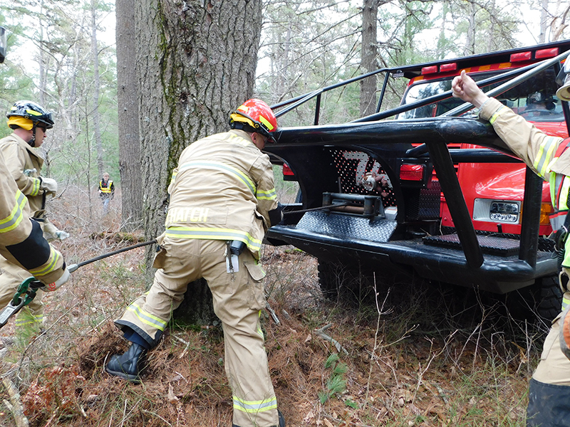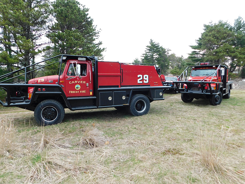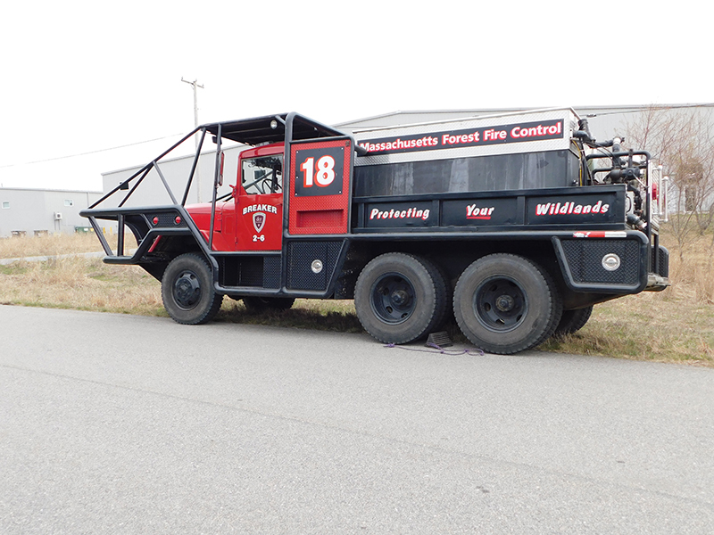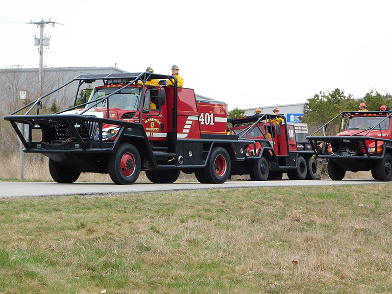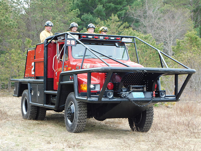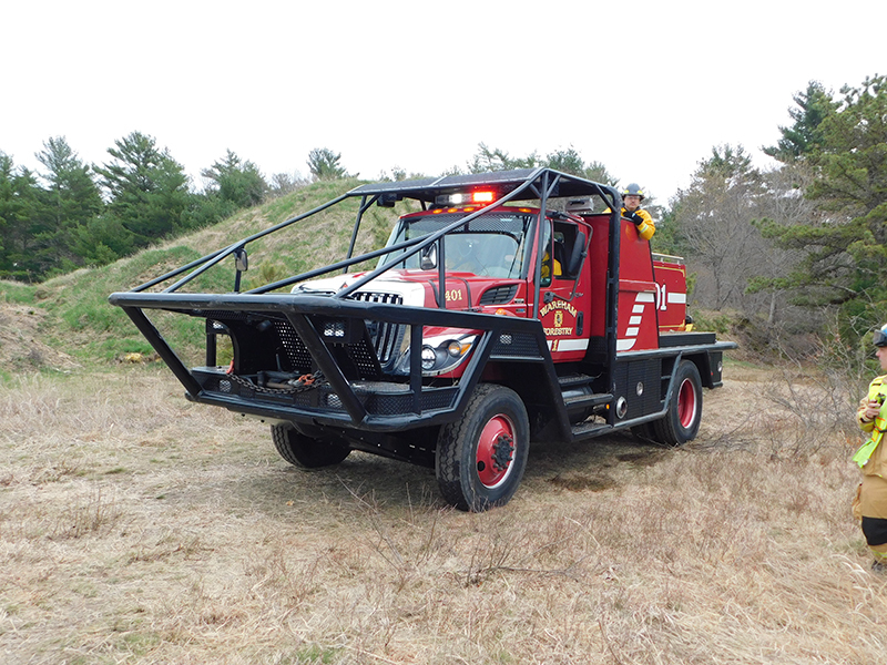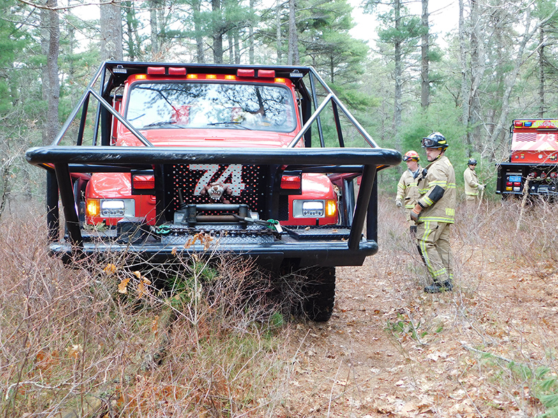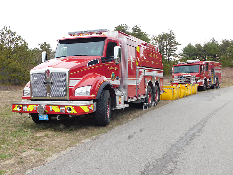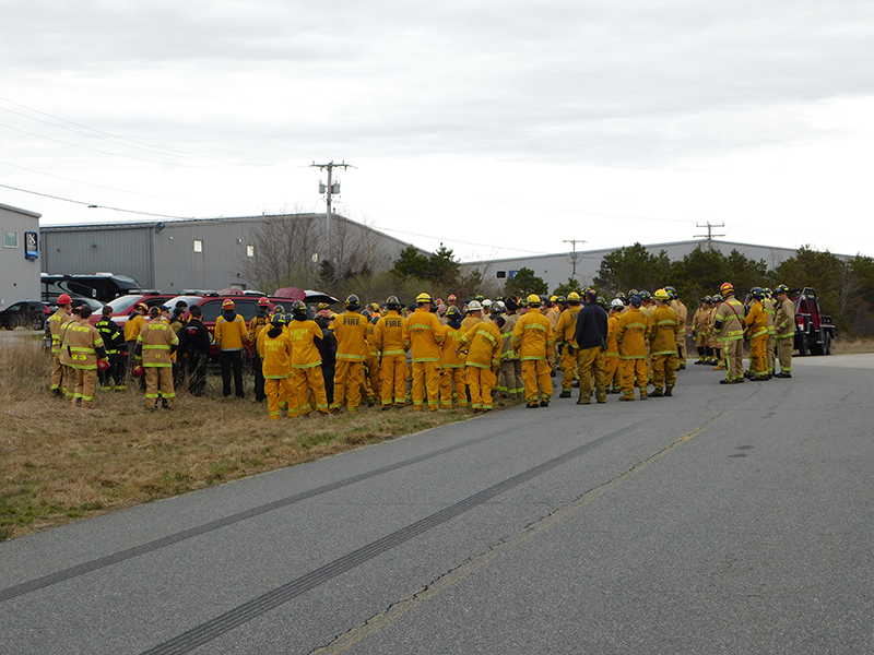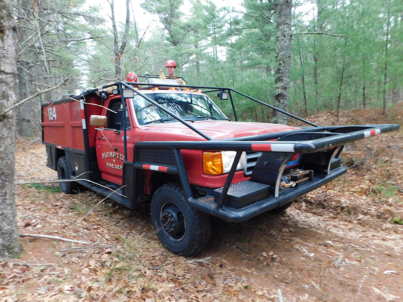 This year’s Annual Deputy Drill focused on a large-scale Wildfire training at the Plymouth/Carver Airport area.  For many years, the airport has been kind enough to allow us to use a large rear wooded parcel to practice our breaker driving skills under realistic conditions.  An estimated 150 Officers and Firefighters from 9 Towns and State agencies, utilizing 14 Brush Breakers, 1 Forestry Truck, 2 Tankers, 2 Engines, numerous Command Vehicles, and Chief Officers, participated in the morning exercise.  The drill focused on brush breaker driver operator training techniques, wildfire crew operations, water resupply training, a chainsaw safety class, and a brush breaker winch operations course.  Brush Breakers, guided by our Fire Officers and Station Trainers, traveled a heavily wooded course set up by Deputy Germaine to simulated flanks of the fire, driving through a wood road course utilizing all the water each carried.  A water supply training component with crews consistently refilling each Brush Breaker using Tankers 1, Tanker 2, and Engine 2.  Tankers 1 and 2 shuttled over 15,000 gallons of water for breakers to quickly fill up and get back to work.  A big thank you to all our Officers and Firelighters for attending and helping throughout the day! Overall, our goal of giving each Firefighter a real-life training experience and increasing their knowledge of working with our large bush breakers was accomplished!  Hats off to Deputy Germaine for organizing the drill, CFD Assistant Deputy Boyle, our Officer core, and Chiefs and Officers from surrounding communities for giving up their Sunday to help! Big props to our Station coverage crew and our awesome chefs back at Station 1, who served almost 200 hamburgers and hot dogs to the hungry troops at the conclusion of the drill. (Photo’s by Retired CFD Firefighter, Rick Leopardi)