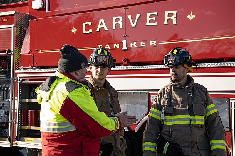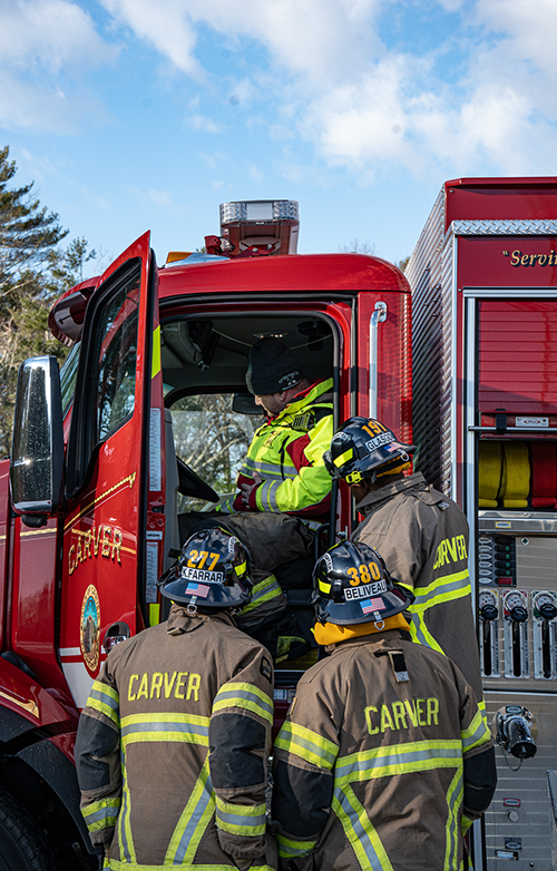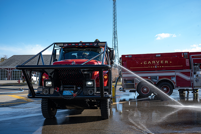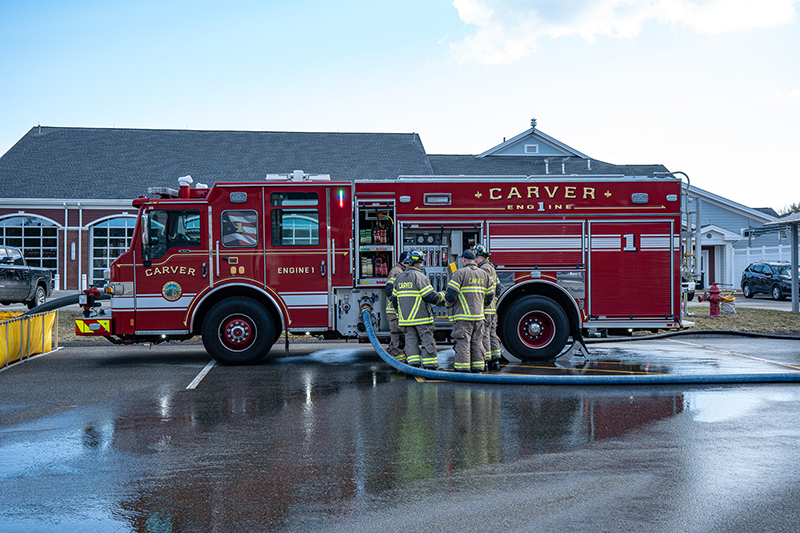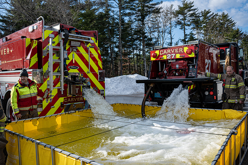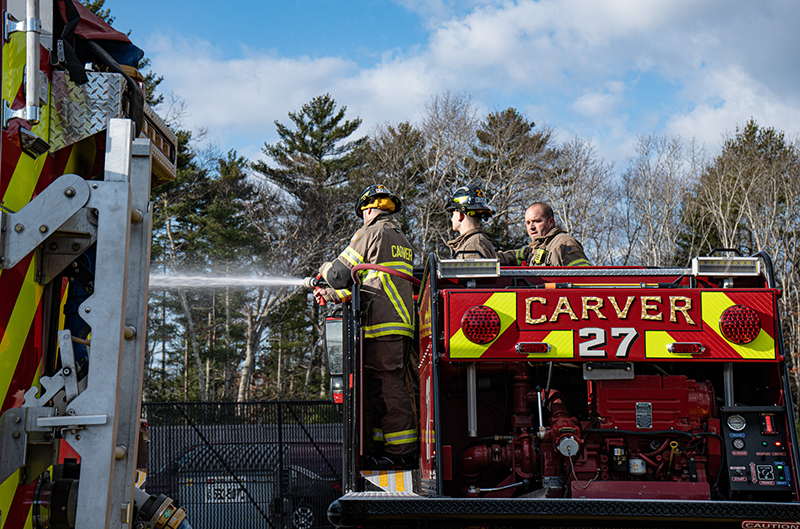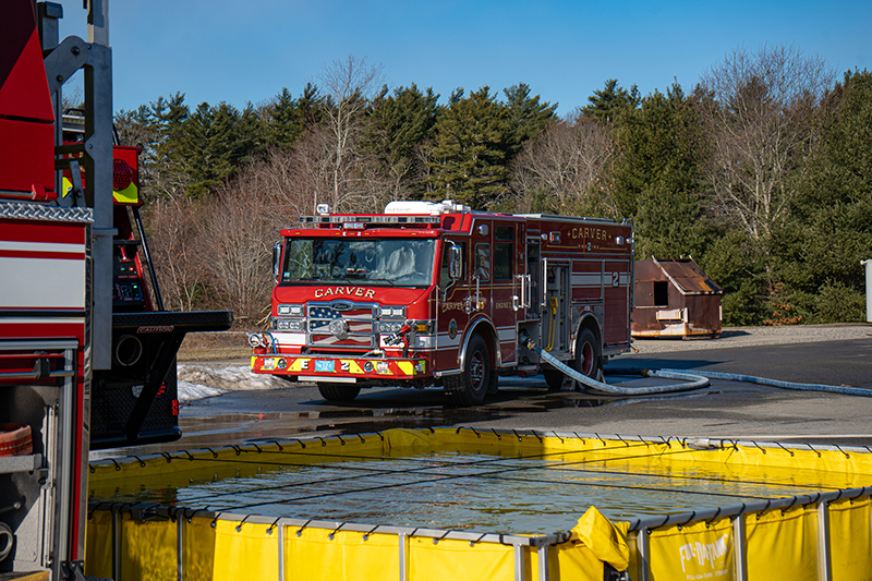 Our Recruit Trainers go above and beyond in teaching our five newest Firefighters proper fire pump, fire hoses and stream operations. Firefighters got a chance to operate our front line Engines, a Brush Breaker and a Tanker, pumping and practicing hose techniques in realistic operational scenarios.  Learning how to draft water out of our portable pools is a must when you become a firefighter in Carver.  Firefighters also practiced hose packing and deploying techniques, selecting correct nozzles streams and flow pressures, hose rolls and other techniques our new firefighters will need when working fire incidents.  Our Training Facility with onsite pressurized hydrants helps take everything to the next level. Great Job TEAM (Photo’s by Future CFD Firefighter, Matt Heath)