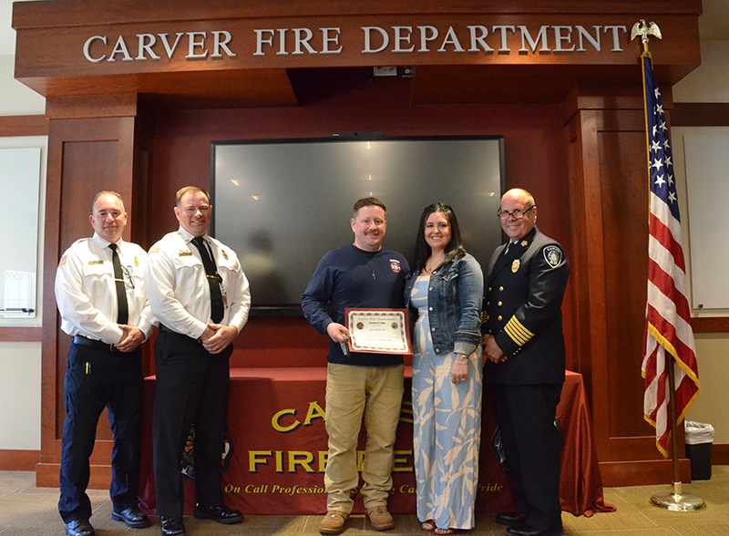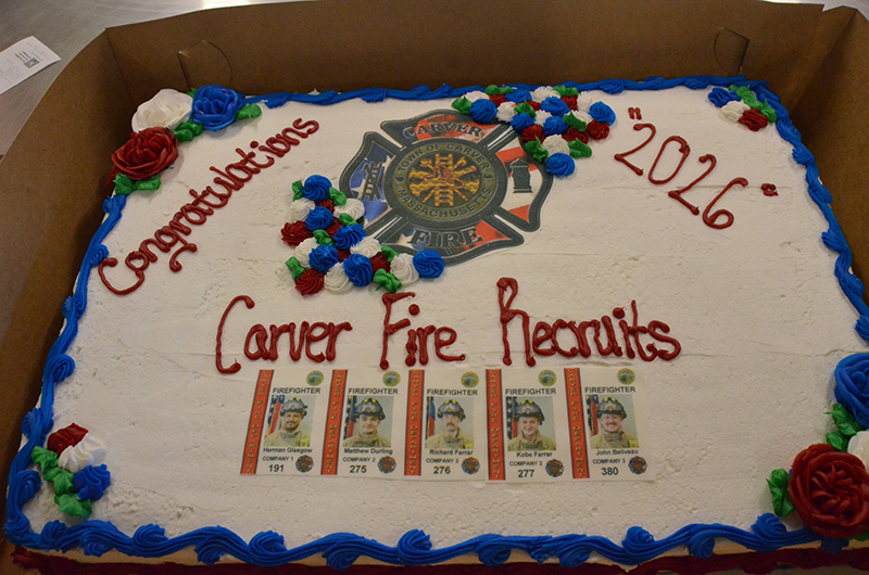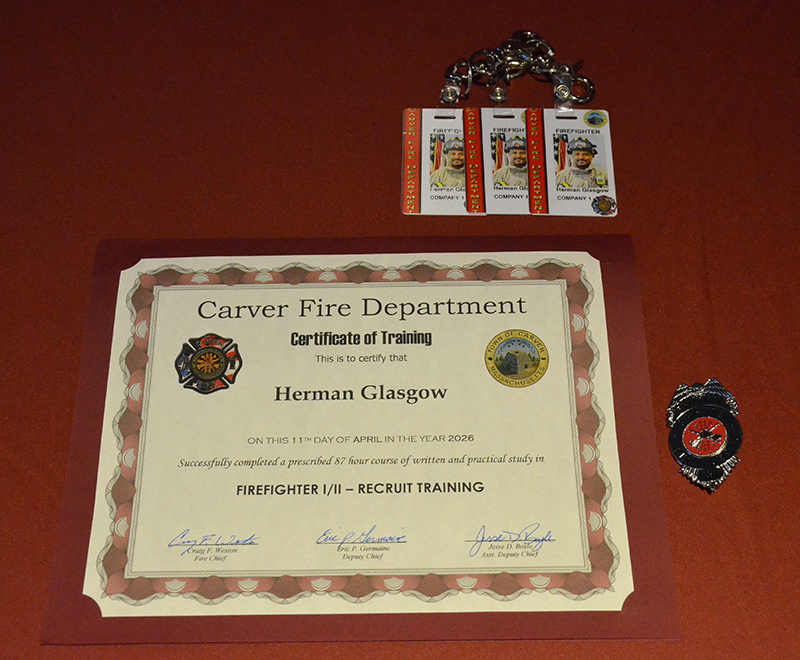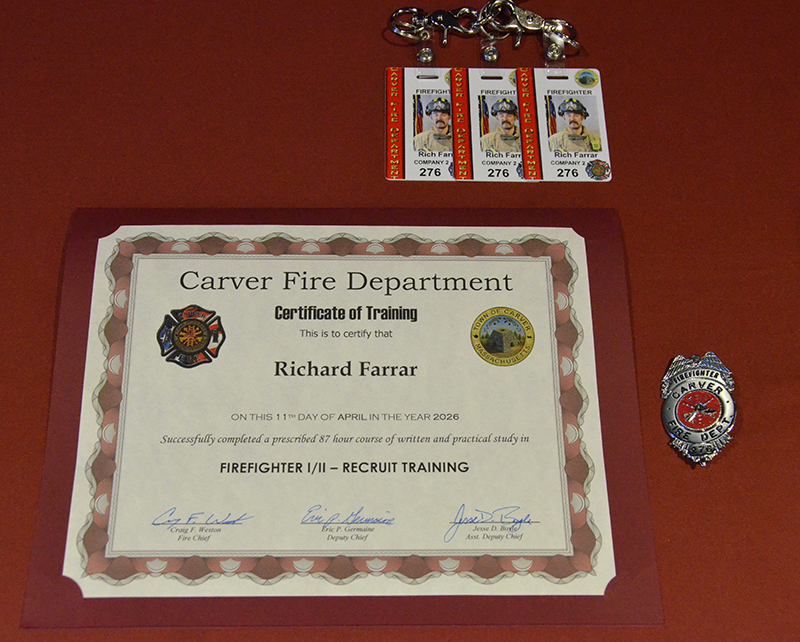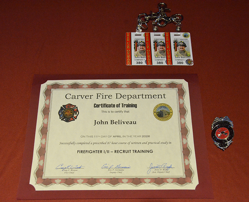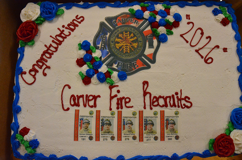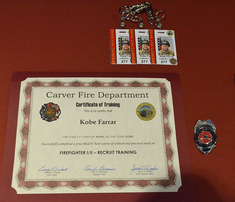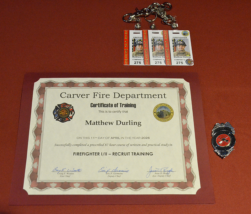 Our new Recruits last training class was a good one – Live Fire Training.  Crews practiced live fires on the first and second floors of the training building.  Each team of new firefighters responded as an Engine Company, utilizing Engine 1 to the Training Facility for multiple simulated structure fires.  Each recruit got a chance to operate the different positions of a structural entry team, practicing nozzle patterns and positive pressure ventilation.  It was a long day, but a tremendous amount of experience was gained that will help these new Firefighters transition into a great CFD career.  After the morning practical, it was on to graduation….  Family and friends attended to witness that special moment when titles change from Recruit to FIREFIGHTER! The ceremony included speeches by Select Board Chairman Mark Townsend, Town Clerk Cara Dahill, Association President Bob Middendorf, Deputy Germaine, Assistant Deputy Boyle and Chief Weston. Official Department Badges, Accountability ID’s and Graduation Certificates were presented.  This was a day to remember. Please join me in welcoming our newest Carver Firefighters in the Class of 2026. (Photo’s by Firefighter, Steve Falconer)